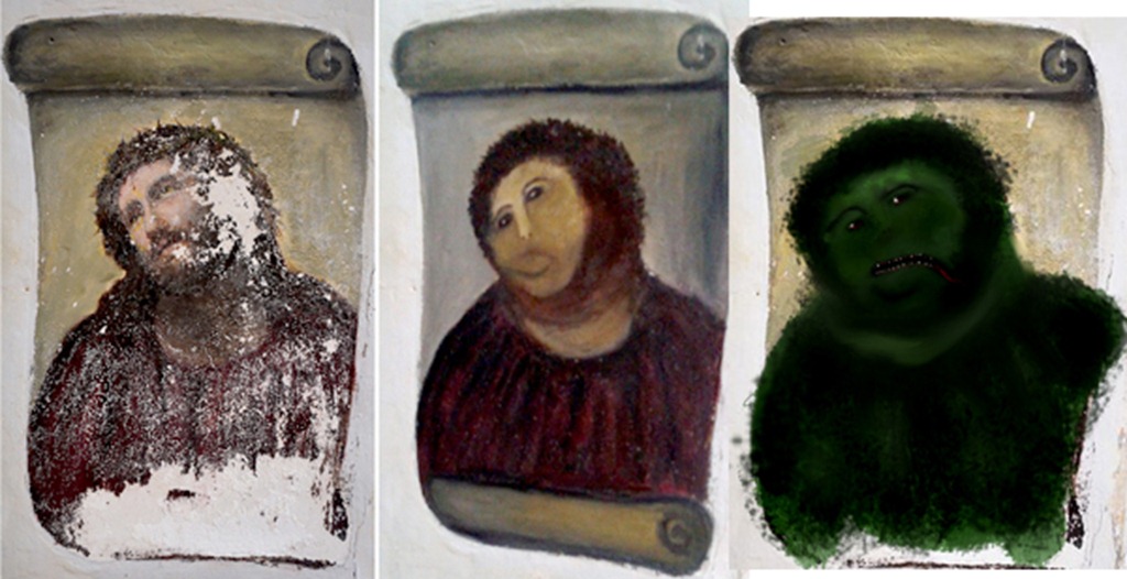 As was recently reported in the Daily News, an 80 year old woman decided restoration efforts of 19th Century Spanish Fresco "Ecce Homo" were taking too long. She transformed the fresco depicting Jesus with his crown of thorns into the monkey faced savior and internet meme known as "Ecce Mono." The BBC likened the repair to "a crayon sketch of a very hairy monkey in an ill-fitting tunic.”