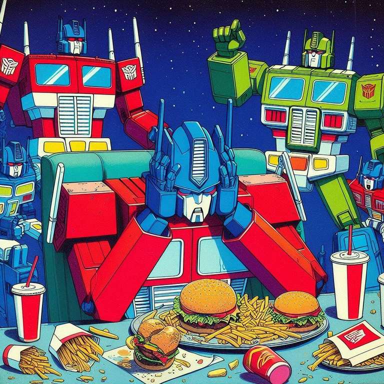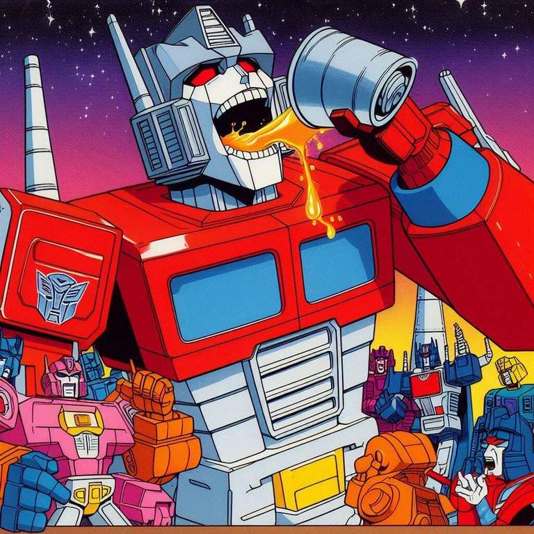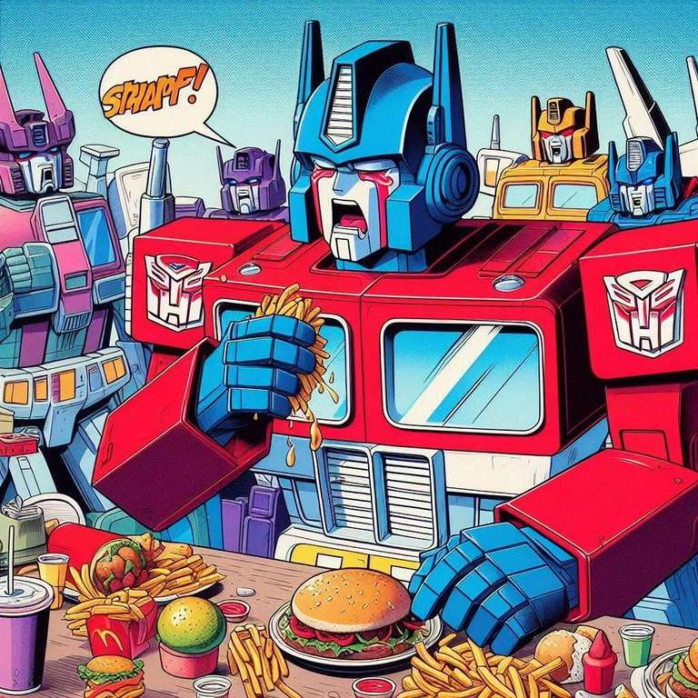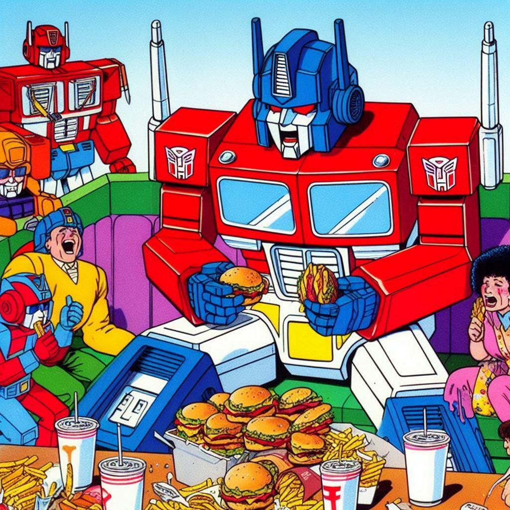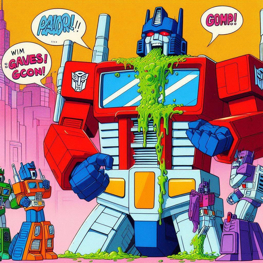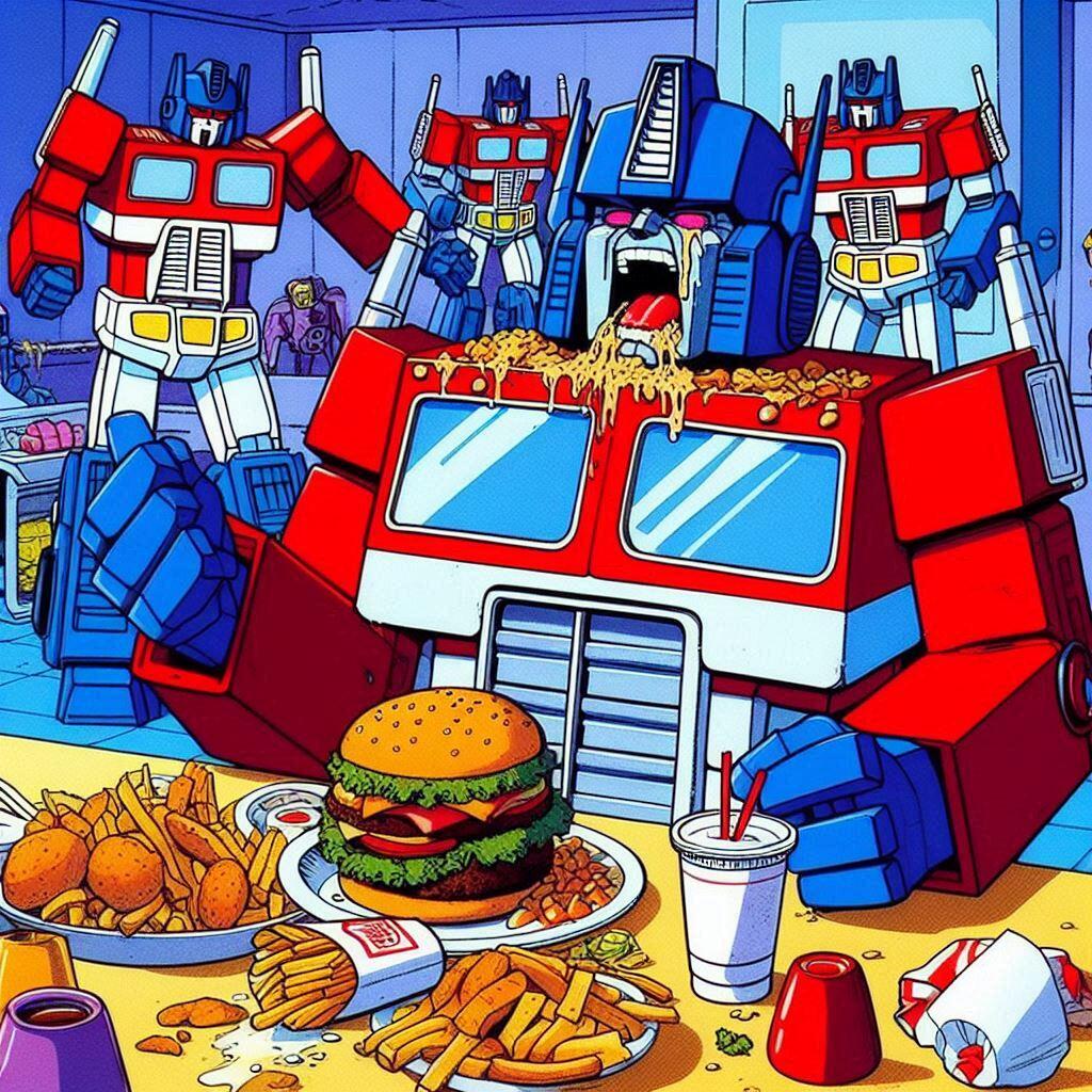 A lot of artists hate AI. I get it. But what artist is going to spend days and days drawing Optimus Prime overeating? None that I know. The quality level of these is questionable, but flipping through them gave me a chuckle. These are actually all screw ups from another idea I had called Galvatron Gulping Gavescon.