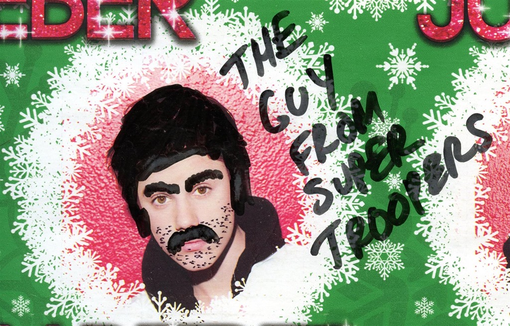 On the tenth day of Christmas Justin Bieber dressed for thee: Ten Guy from Super Troopers Nine Kristen Stewarts Eight Boris Karloffs Seven Selena Gomezs Six Amy Winehouse Five Jason Priestleys Four Taylor Swifts Three Osama Bin Ladens Two Khloe Kardashians and a Kelly Osbourne with red cheeks
